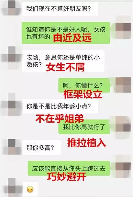 这是和女生互动中期的聊天记录,女生开始态度有点傲气,可我们不能一味顺从,假意打击她,攻破她的自傲和防备心理,最后又圆回来,体现自己绅士风度。