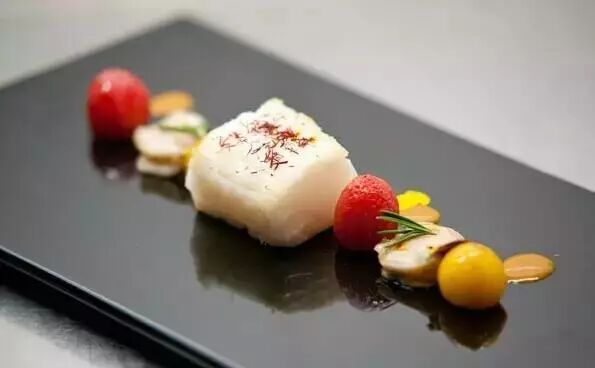 仔羊排压熟,改刀成均匀的块;改刀好的羊排,用藏红花汁煨制;煨好的羊排摆放好,浇藏红花汁芡即可。