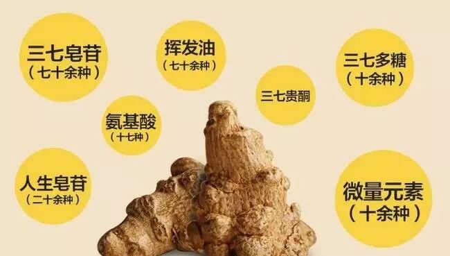 目前国家批准实验的保健品共有24种功能中三七就占19种功能。三七的成分为三七皂苷、黄酮类化合物、三七的糖类成分、三七中的挥发油、三七中的氨基酸成分、三七中的微量元素、植物油脂、淄醇和炔、烯、烃类化合物等。