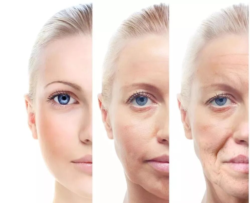 脸下半部下垂逐渐明显,上眼脸明显凹陷;嘴角两侧出现皱纹、肌肤开始松弛、下垂;开始出现老年斑。