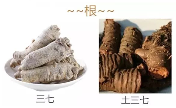 三七质地坚实,断面呈灰绿色或黄褐色,且断面呈放射状排列,俗称菊花心,皮部与木质部较易分离;而土三七质地疏松,断面黄色,无菊花心。