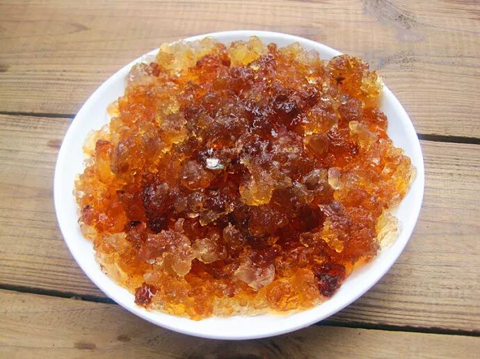 桃胶是一种浅黄色透明固体天然树脂,由桃树树皮中分泌而来,于夏秋采收,其成分与阿拉伯树胶大致相同。性味甘苦,平,无毒。桃胶又名桃油,桃脂,桃树胶,桃花泪,日常生活中并不多见,但它是一款具有良好养生保健的食材及中药。