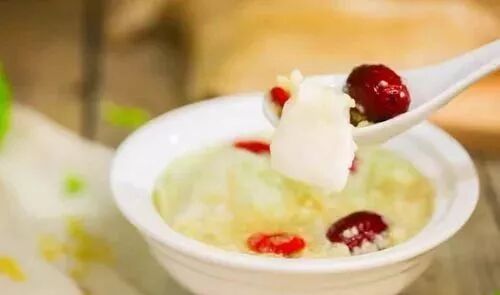 鱼胶15-20克,糯米,枸杞,桔子饼(切丝)适量。将所有材料洗净,放入高压锅煮熟,下冰糖调味即可食用。