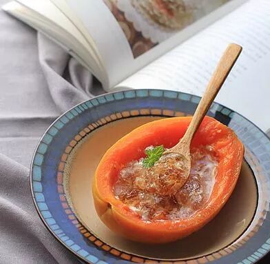 4、木瓜对半切开,去籽,将隔水蒸过的桃胶倒入木瓜中,撒上少许冰糖,再继续蒸20分钟左右即可。