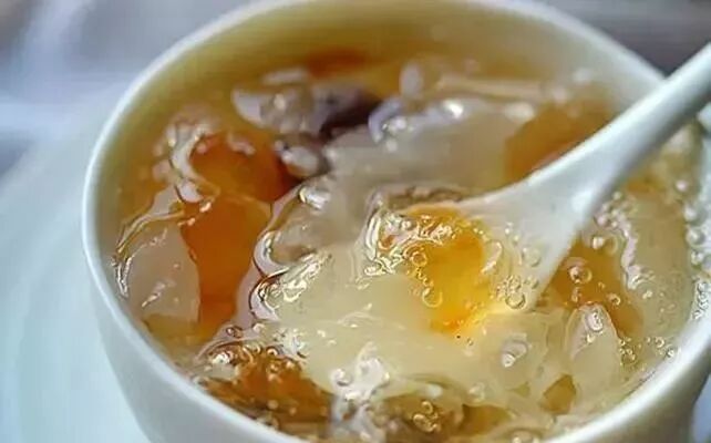 7.待桃胶银耳煮至软糯粘稠时加入适量黄片糖,糖融化后即可食用了。