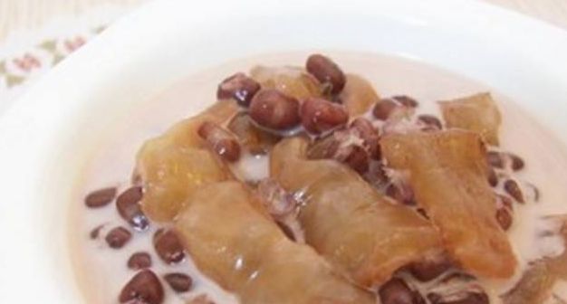 做法:红豆洗净泡上两个小时,花胶发制好切成小块。所有材料备好后和水一起入炖盅炖上两个小时,炖好前二十分钟加入冰糖即可。