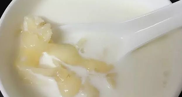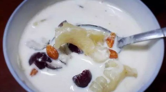 做法:干花胶加清水泡发一夜,取出在开水中淖一下至软身;花胶放入炖锅,倒入牛奶,水开后隔水炖1小时;加适量冰糖,焖20分钟令冰糖融化。