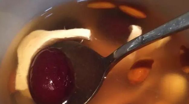 2、花胶煲了3个小时后才放银耳(银耳煲1小时左右),最后放红枣(红枣煲20分钟左右),最后一分钟放冰糖。