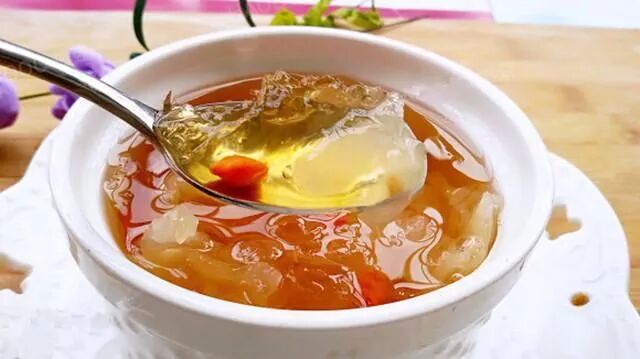 7、待桃胶银耳煮至软糯粘稠时加入适量黄片糖,糖融化后即可食用了。