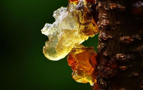 一到夏天,农村里农民们种植的桃树上,和桃树结出的桃子上就会产出这样的胶体。黄黄的,黏黏的,有点像琥珀一样。