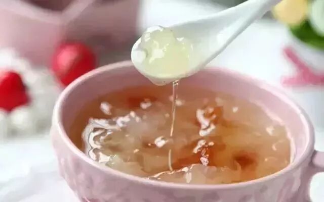 7.待桃胶银耳煮至软糯粘稠时加入适量黄片糖,糖融化后即可食用了。