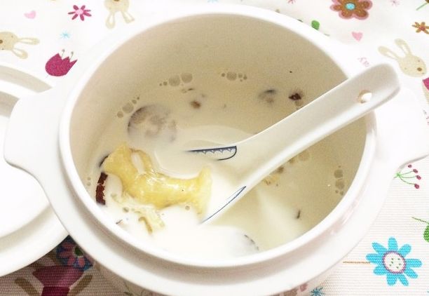 材料:花胶50g,牛奶600g,红枣2粒,枸杞数粒,冰糖适量。