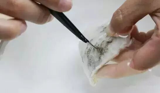 准备好2-3个小碗,装入少许的水,用镊子与网罩,将燕窝中的小毛与杂质慢慢去除。(最常用的方法)