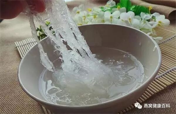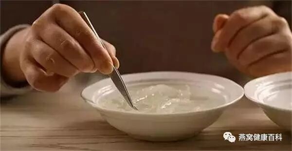 泡好的燕窝,晶荧透亮,完盏类的丝缕分明,用手捞起来,不会轻易断掉,能整个盏都捞起来。燕窝泡好后,黄燕中的毛会显得多些,白燕稍有细毛,这种细毛,如果不多,可以用摄子夹出来。如果感觉多,可以用清水多洗几次。
