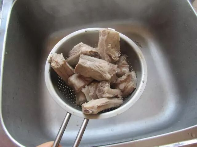锅中注入适量清水烧开,淋入少许料酒,倒入洗净,切好的猪骨块,拌匀,汆约1分钟去除血水,捞出,沥干水分,装盘待用。