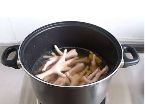锅中注入适量清水烧开,倒入鸡爪,汆约1分钟,除去浮沫,淋入少许料酒,煮约半分钟除去异味,捞出,沥干。