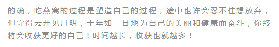 坚持吃燕窝,从3个月开始,向3年甚至更久目标迈进发。为了美丽、为了健康,吃燕窝何尝不是一项得大于失的投资!