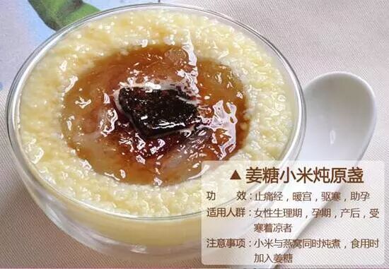 作用:用燕窝搭配养胃暖身的小米与驱寒补气血的姜糖,能调经、缓解痛经。