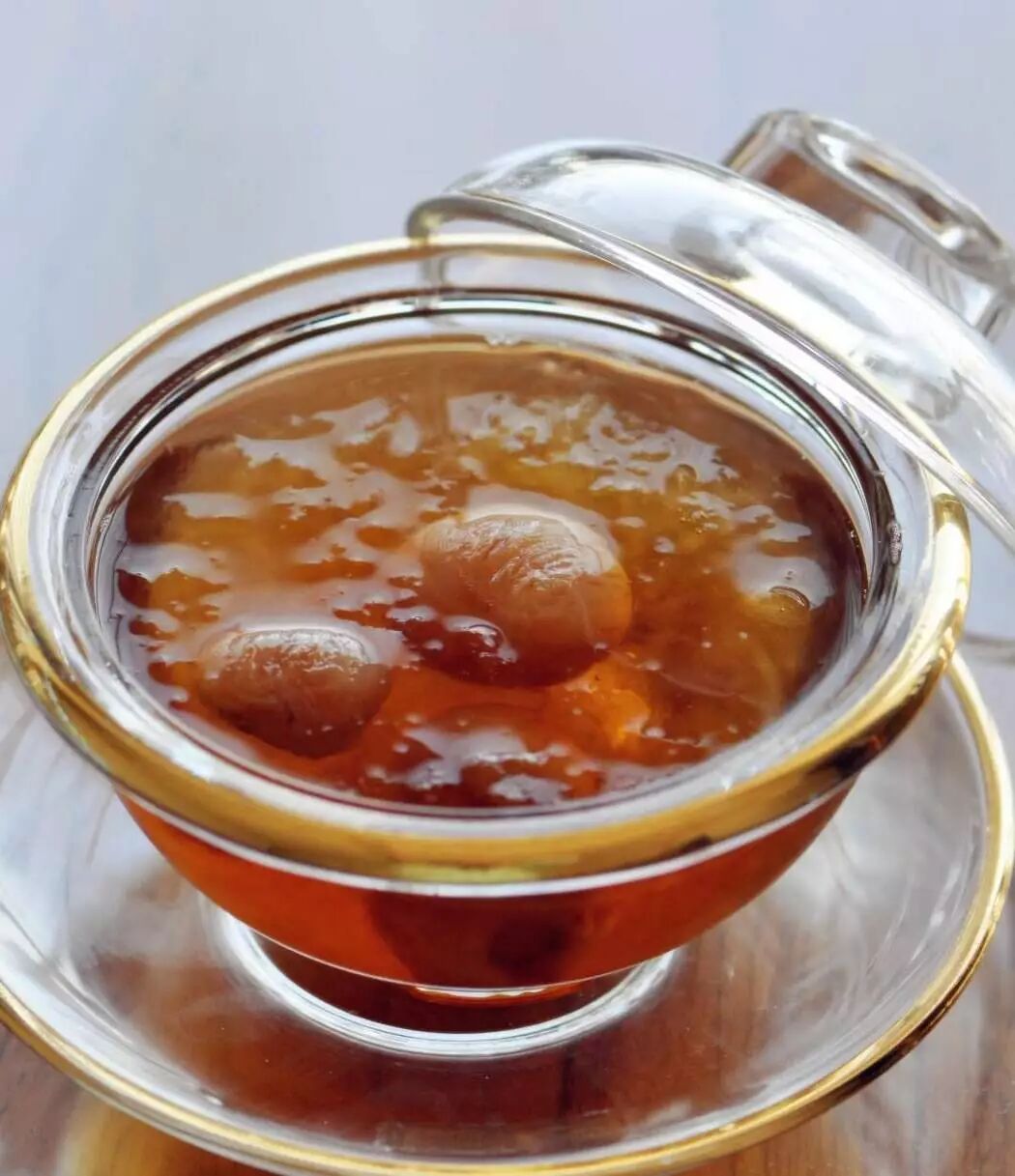 3.燕窝放进炖盅里,倒入纯净水,隔水慢炖15-20分钟,加入煮好的红枣和红糖,慢炖5分钟,红糖完全融化后即可食用。