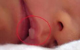 在新生宝宝口腔的上腭中线附近会看到针头或米粒大小的灰白色小点,叫上皮珠,上皮珠是细胞脱落不完全所致;在宝宝牙齿牙龈边缘也会有白色小珠或灰白色硬块,看起来好像萌出的牙齿,俗称“板牙”或“马牙”。