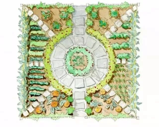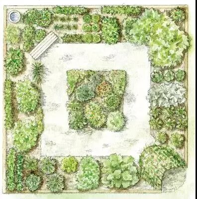 第四种将以上几种结合,形成几何式构图,将水景、花池与蔬菜种植池结合,共同形成多样式景观。