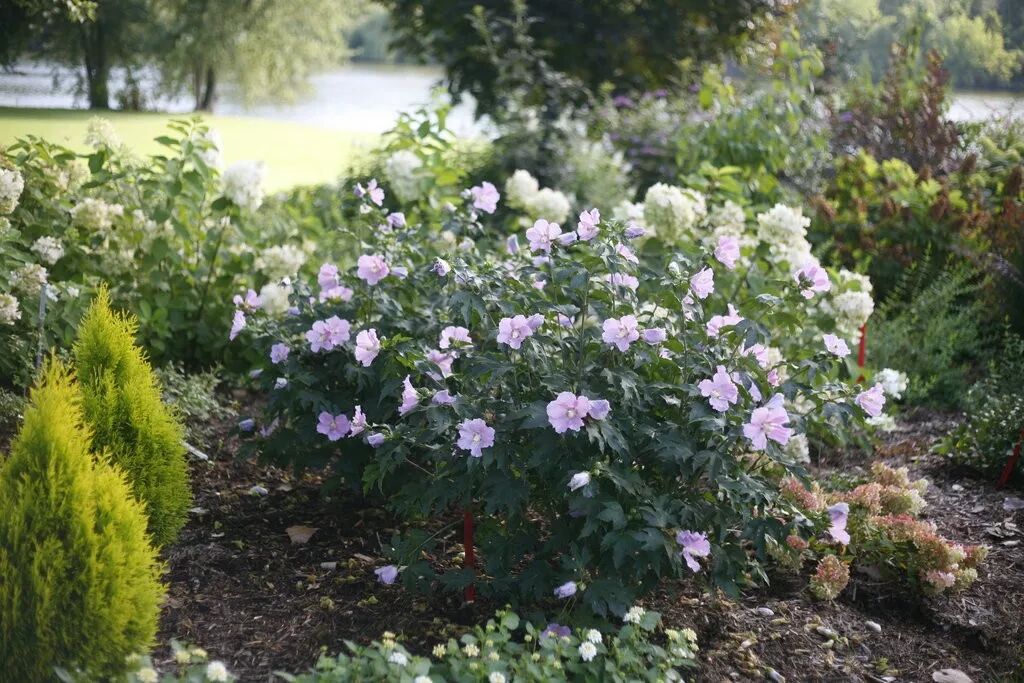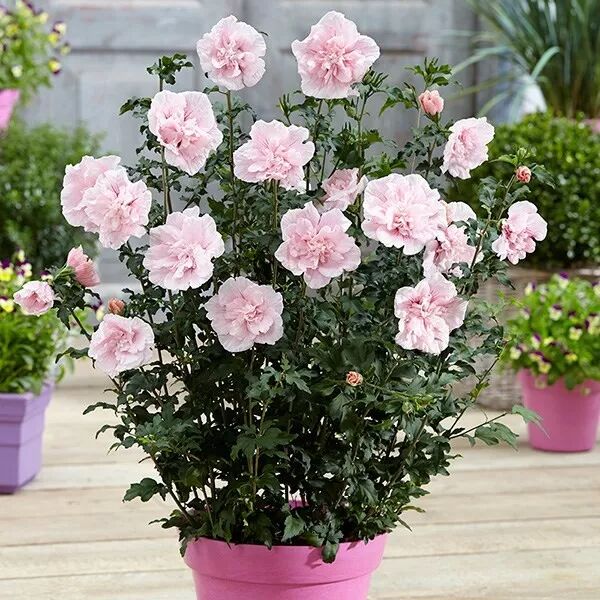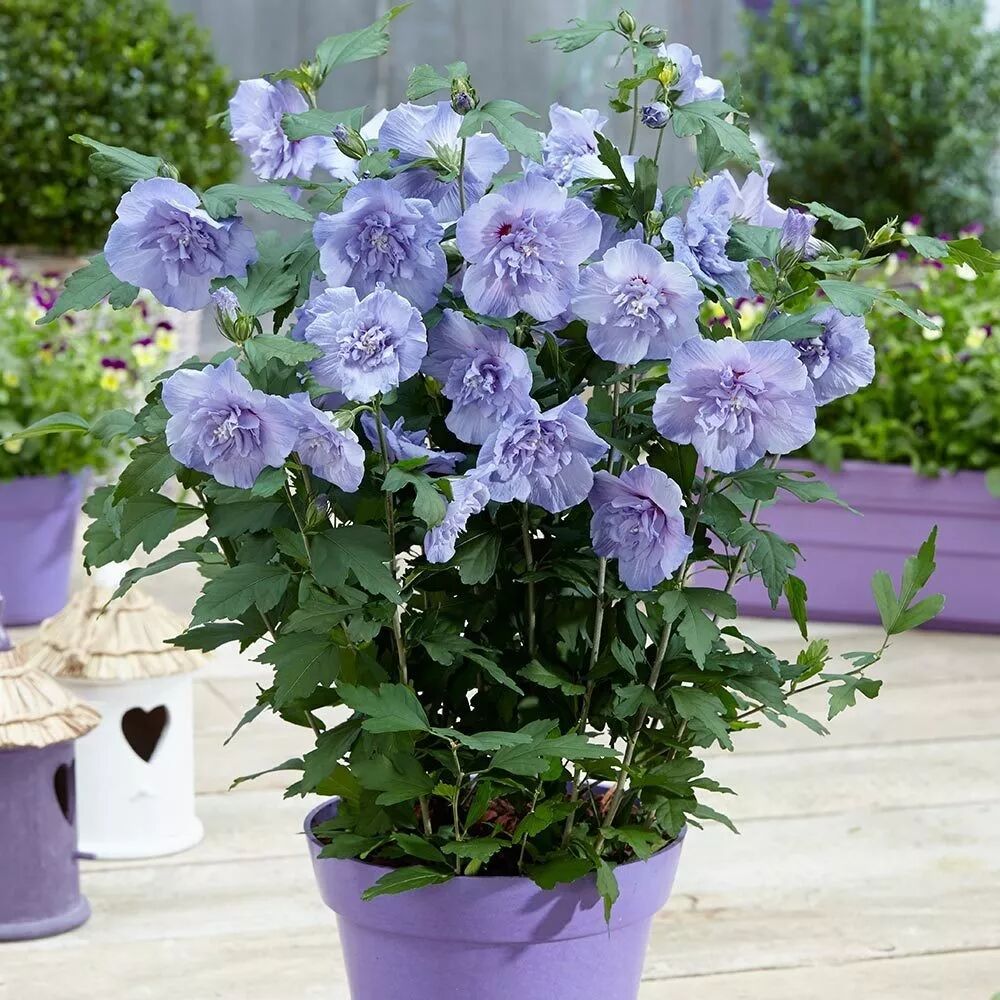 好在,它的表亲——木槿,也同样具有花期长、花量大、耐热等属性,而且还开了重瓣,耐寒,蓝色系的外挂。