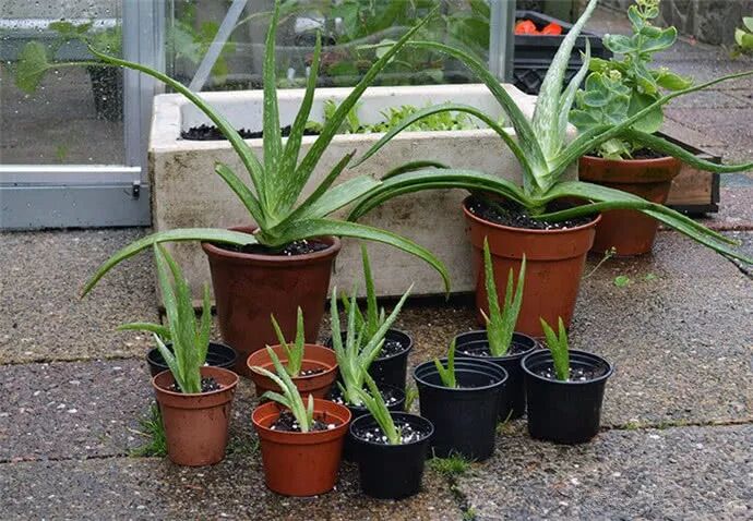 芦荟在生长过程中,会从侧面长出新的小芦荟,把芦荟从花盆中取出,然后将新长出的芦荟从母本中分离出来,选择合适的花盆,将沙子、砾石和营养土按照1:1:1的比例混合,之后将芦荟重新种植,便能收获很多盆芦荟啦。