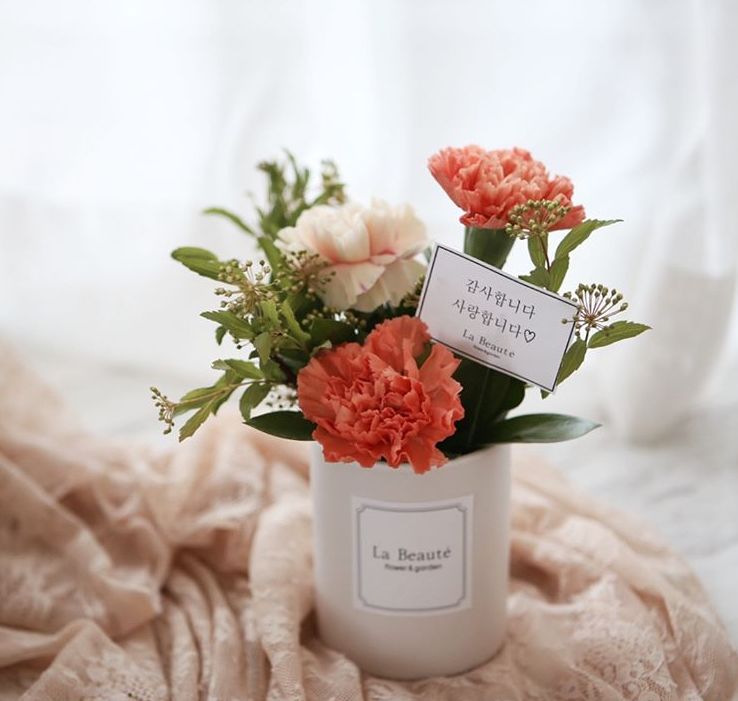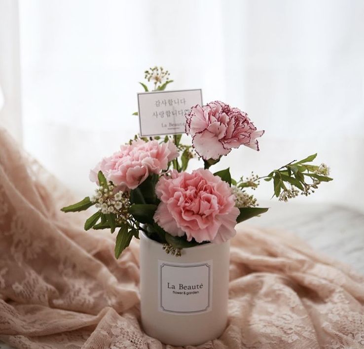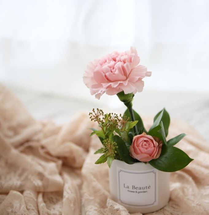 康乃馨颜色艳丽与柔和兼具,瓶插期较长。插花时注意,不能在花瓣上洒水,不要存放时间过长,建议在低湿度条件下养护,光照充足会有利于花苞开放。