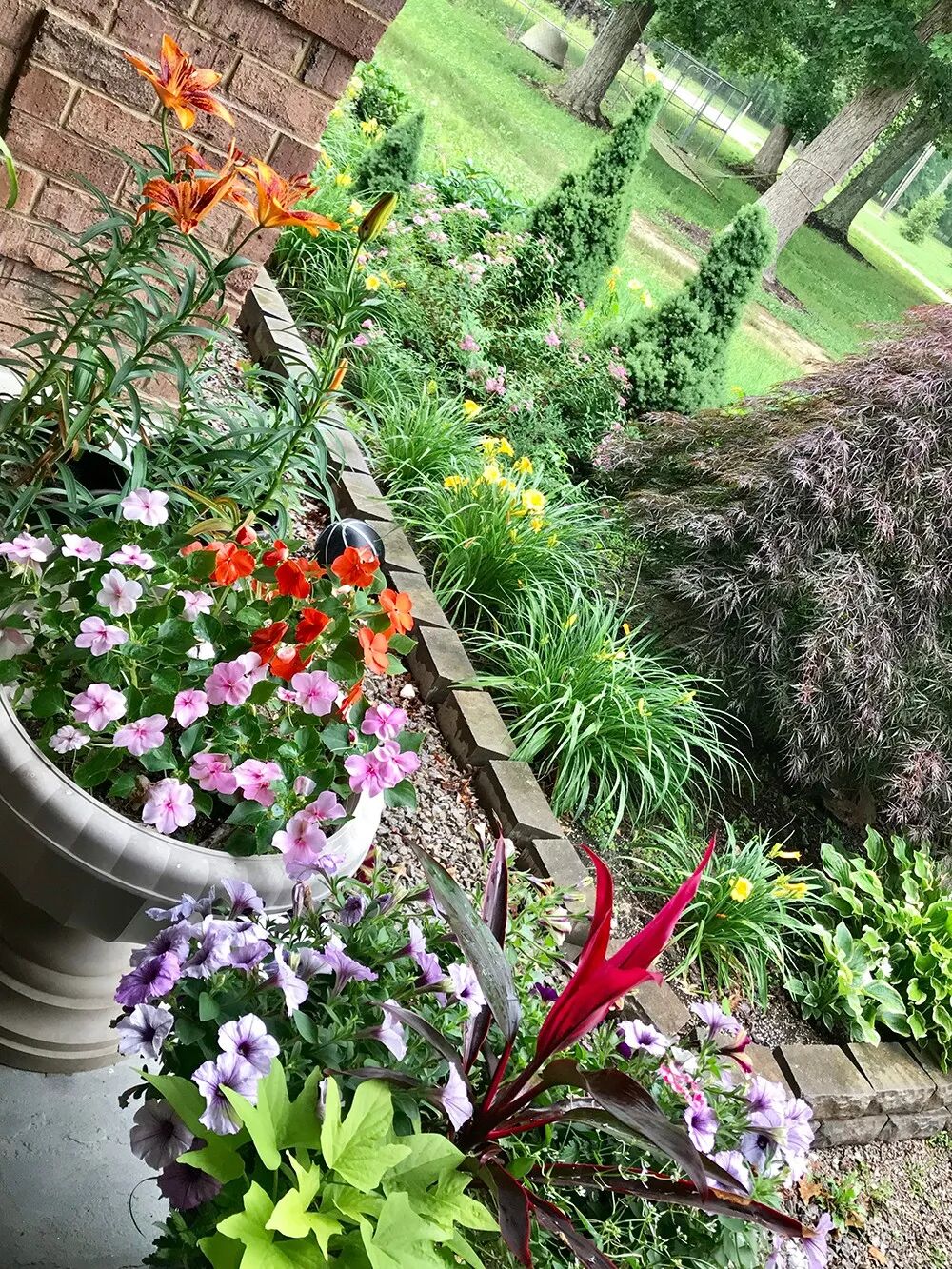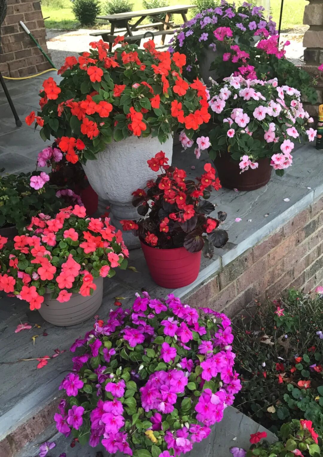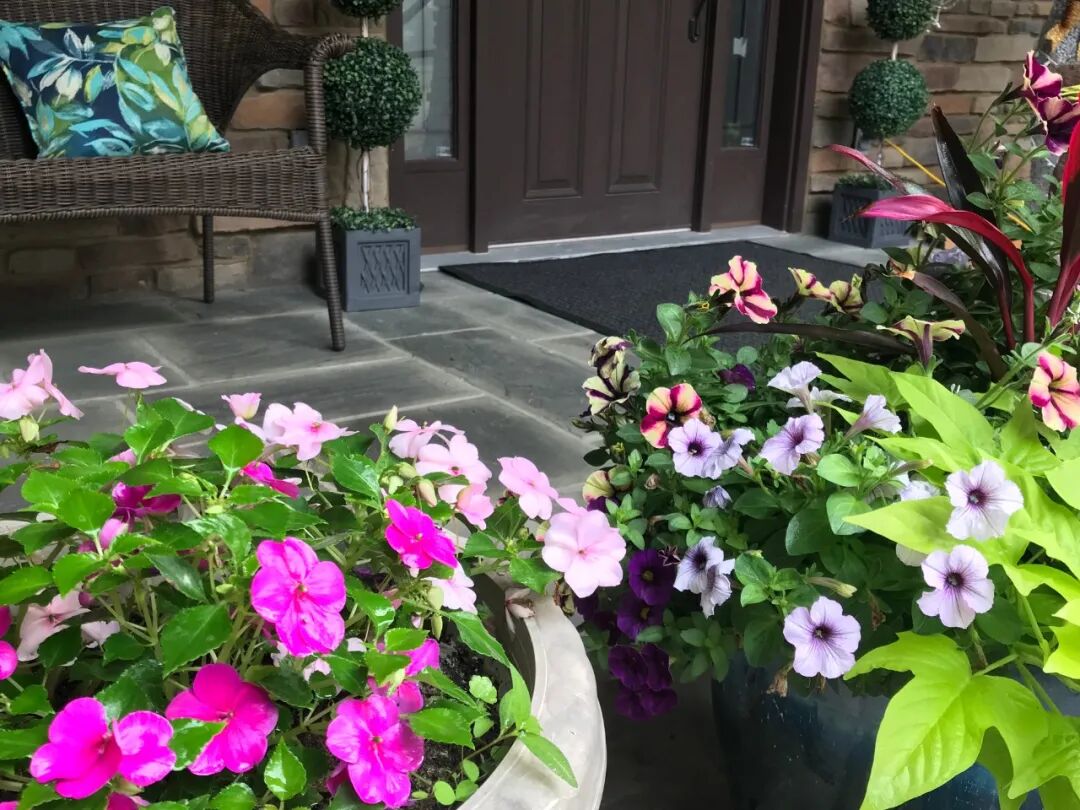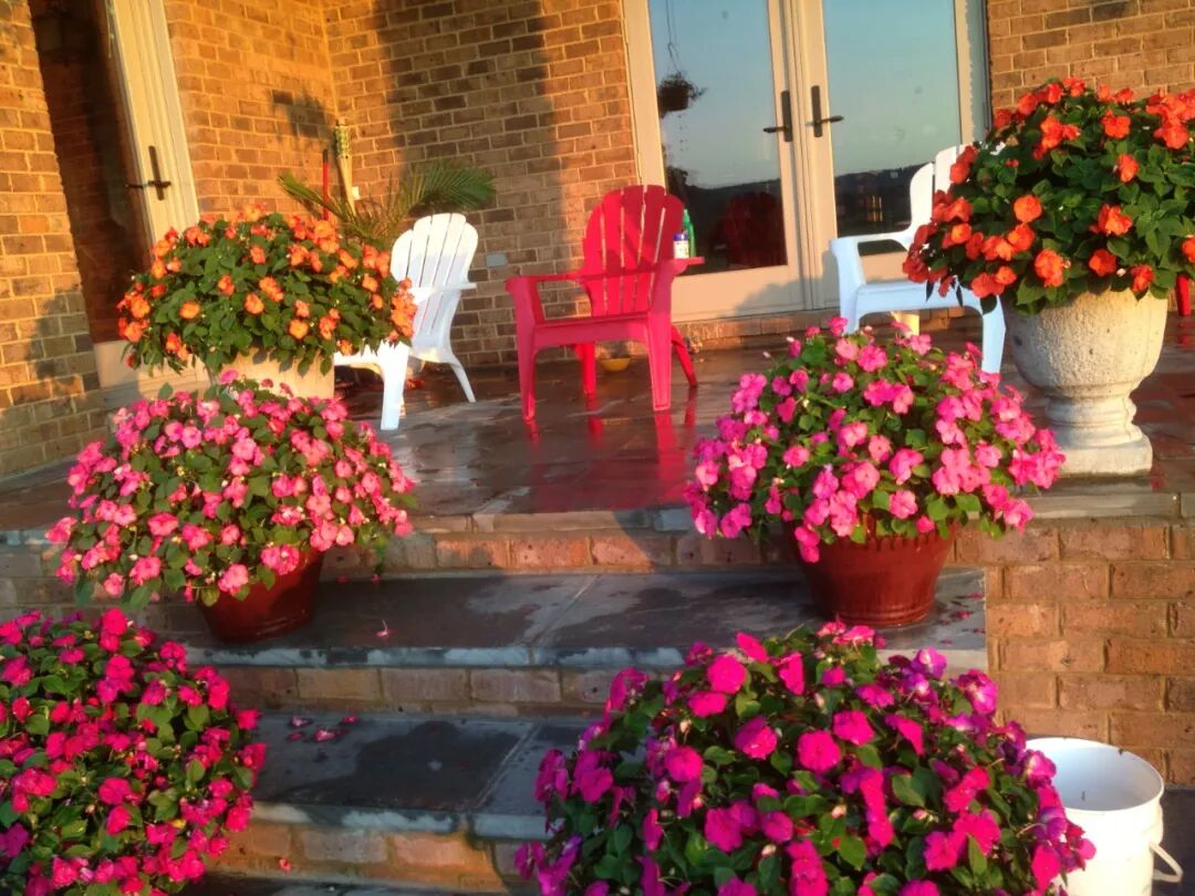 每年5月初,我会买各种花色的小花苗回来,每个大盆种三株,小盆种一株。6月份,它们开始爆花,慢慢长成一个大花球,一直灿烂到10月底霜冻为止。虽然不招虫害、很好养护,但需要有早上或傍晚3-4小时左右的直接光照。