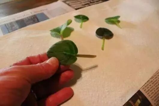 1. 用刀切取带叶柄的叶片,选用翠绿健壮的;