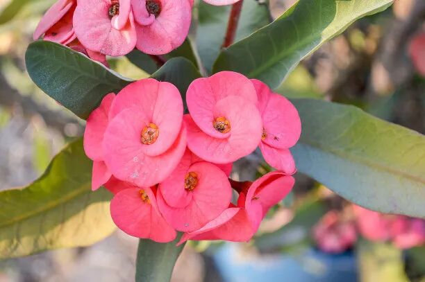虎刺梅在花市上也很常见,它是一种灌木植物,叶片呈椭圆形,四季翠绿,一年四季都能开花不断,有粉红色的,浅黄色的,和翠绿的叶片搭配在一起,清新又可爱,很多人都喜欢在家里养一盆,但是它全身长满刺,还带有毒性,因此多摆放在不易触碰到的地方比较好。