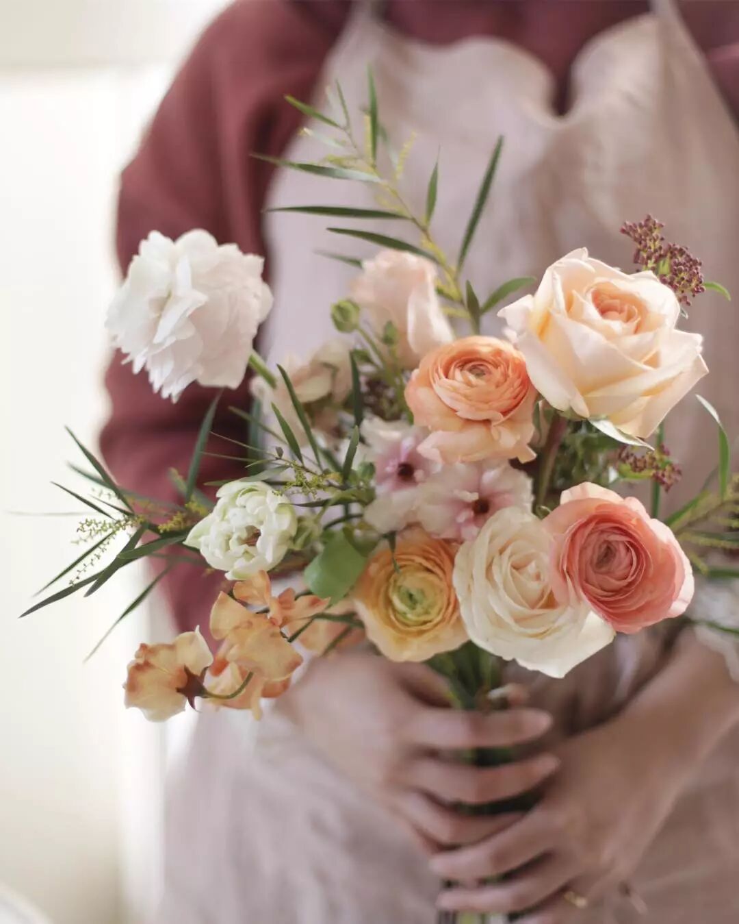 色彩搭配:深浅不一的橙色(主色)+白色(减弱橙色,提亮花束色彩)