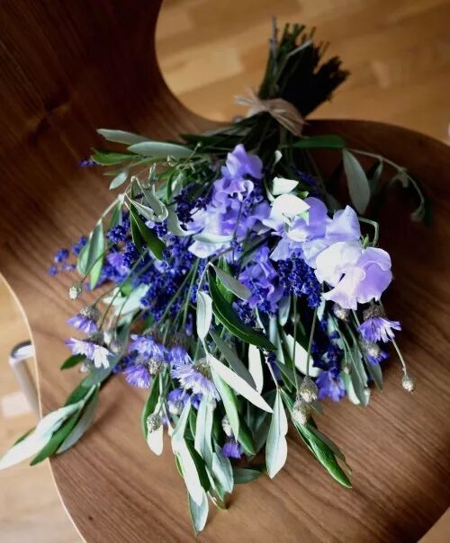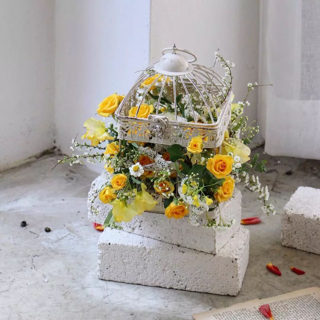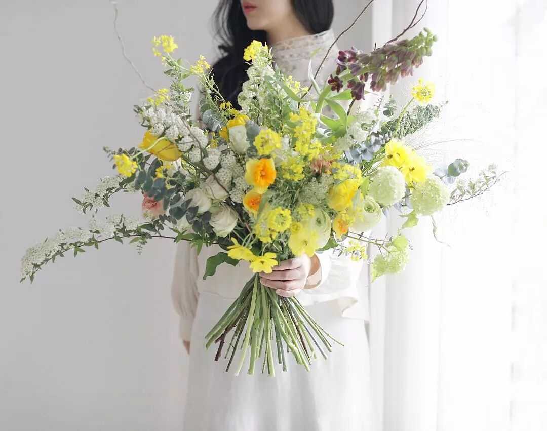 花材搭配:黄玫瑰、香豌豆、雪柳、小菊、勿忘我