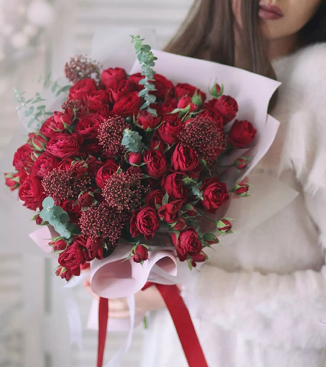 花材搭配:红玫瑰、茵芋、尤加利