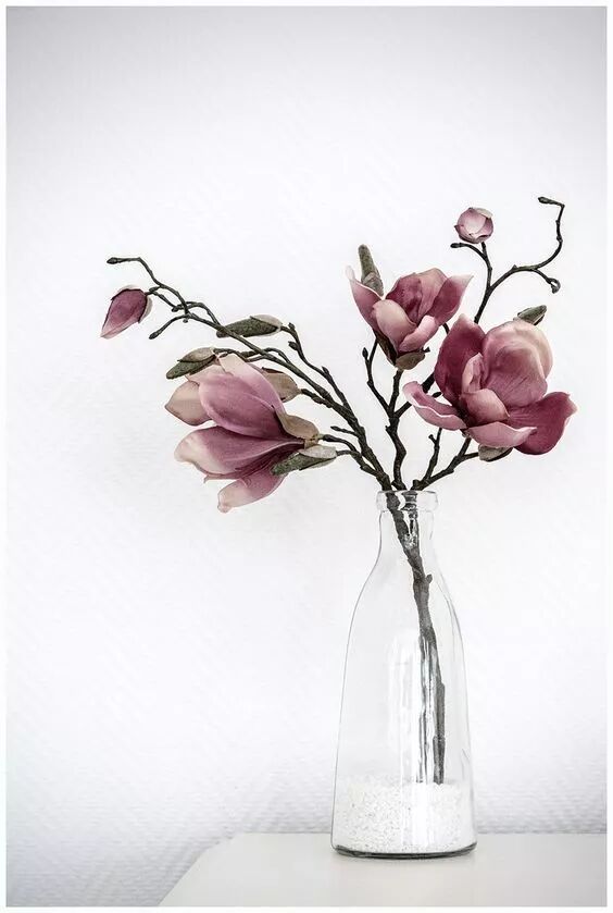 没有人规定鲜花一定要直立摆放吧,选一只透明的花器,让花茎呈自然弯曲的状态。