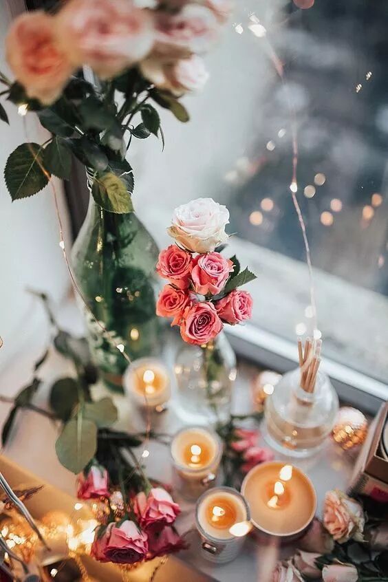 烛光晚餐使用这招真的太棒了。花朵可以泡在容器中,也可以与烛光分开放置。吃什么,已不再重要。