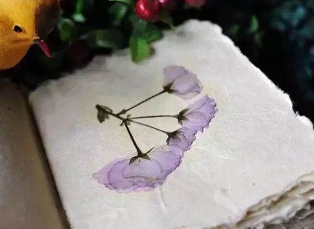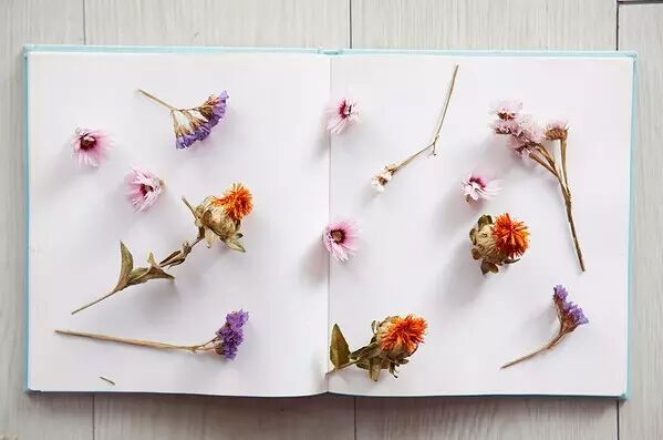 摆好后放上另一张纸压住。将大且重的物品压在夹好花的纸上,比如字典、百科全书等,也可以用重重的盒子和木头。等待1-3周,压花就完成了。你可以像欣赏艺术品一样欣赏平整美丽的压花啦!