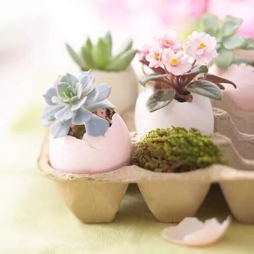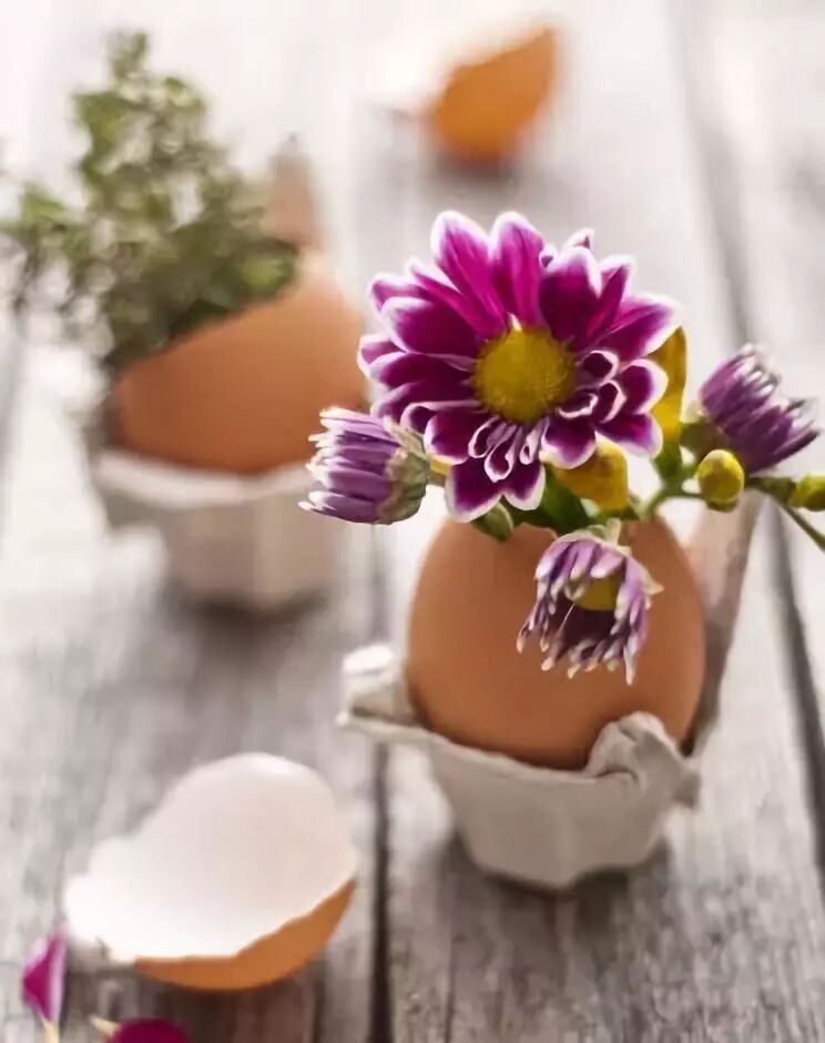 将鸡蛋敲出小孔,取出蛋黄蛋液,装入水或土壤,一个小巧可爱的蛋壳花器就完成了。多肉与鲜花破壳而出,具有顽强生命的植物生长于易碎的蛋壳中,一种交错的美应运而生,不禁让人感叹生命的珍贵与美