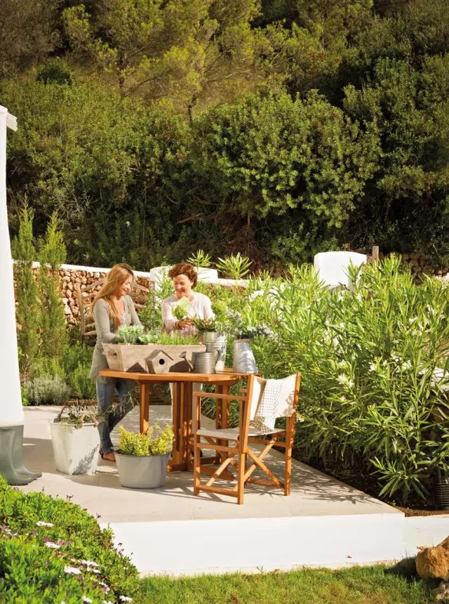 在一起修剪庭院和种植各种树木与花