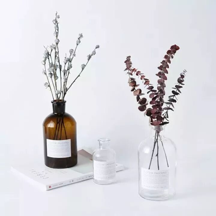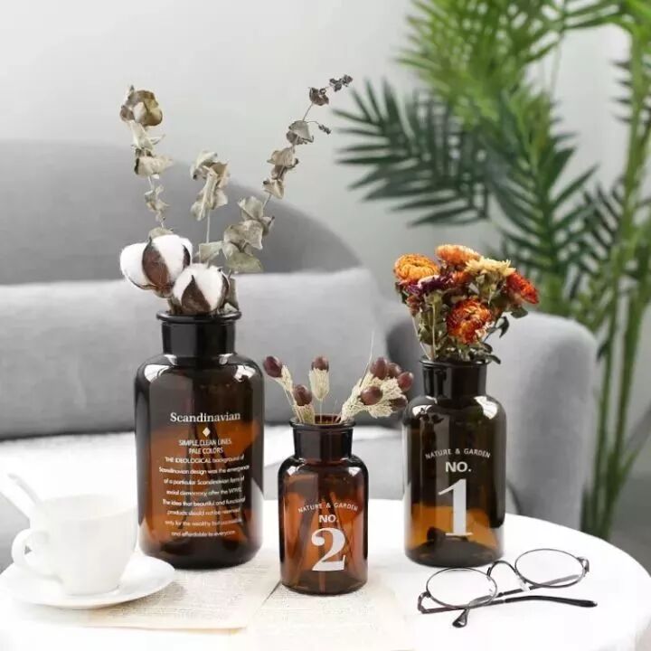 没想到中学实验室里的化学试剂瓶居然会成为网红花瓶吧~是的,这些透明与复古棕色的玻璃瓶正是搭配干花的最佳伴侣,越是简约的瓶子,越不会遮盖干花本身的美