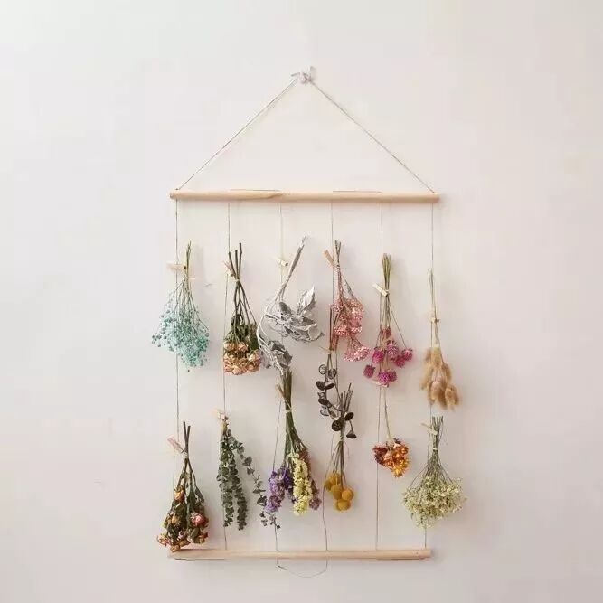 可以从屋顶悬挂一根简单的木棍、铁丝或鱼线,将干花任意排列倒挂;欢迎天马行空,任意想象的好看创意。