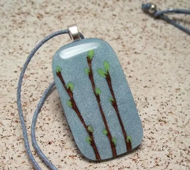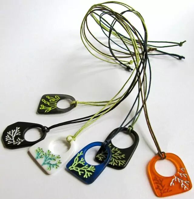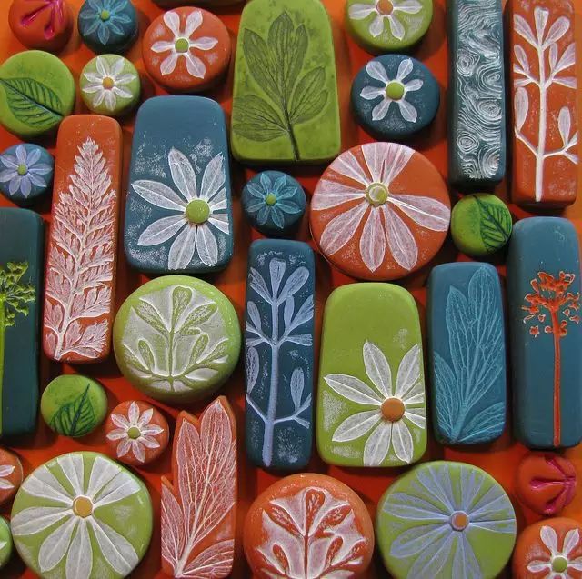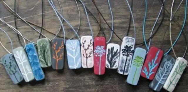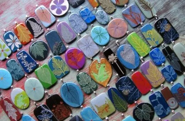她的软陶采用丰富的色彩,将采摘来的小树叶和小花草镶嵌其上,烙出植物的印子、留下花草的纹理以后再取下来。