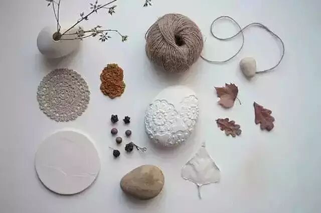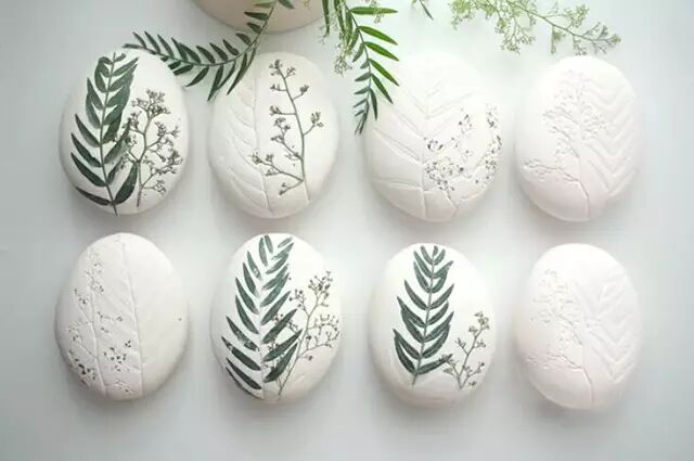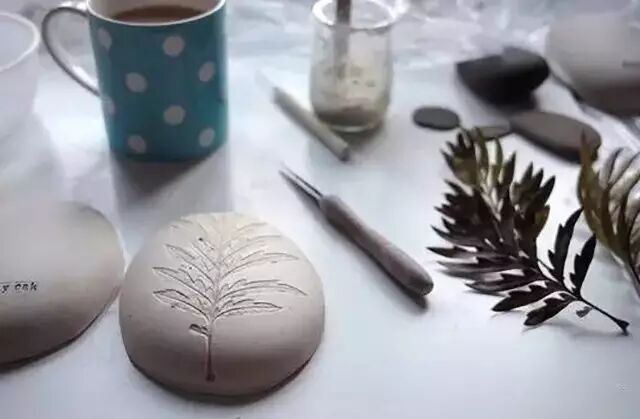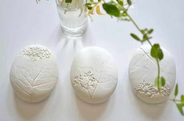 让小小的花草嵌入圆乎乎的黏土石表面,烤干之后再将花草去掉,镶嵌在黏土里的小草绿意盎然,十分生动 。