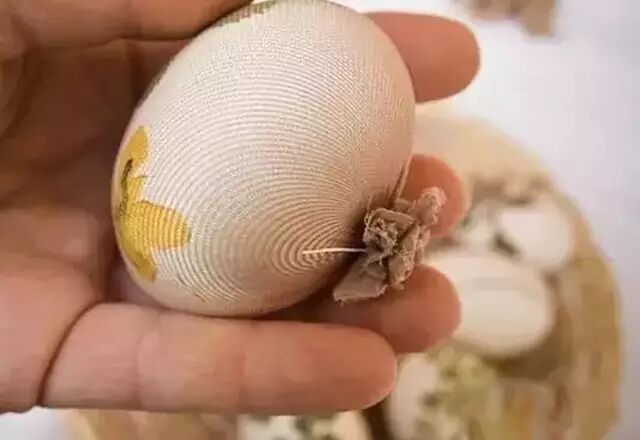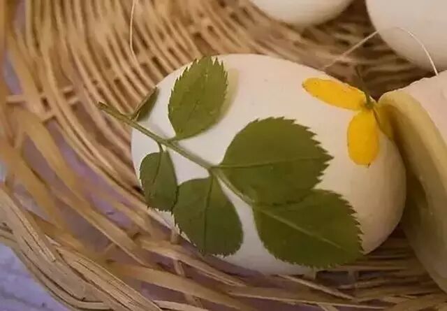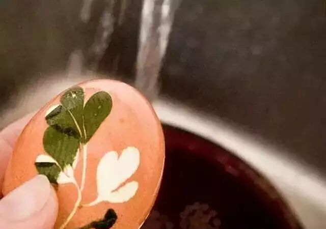 Step5. 煮熟后拆掉丝袜,洗掉花草,蛋壳上就会留下花草的轮廓。