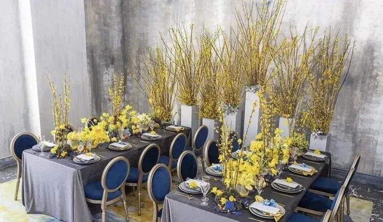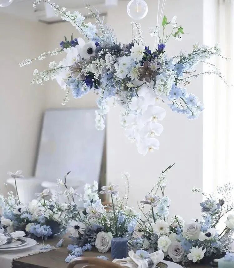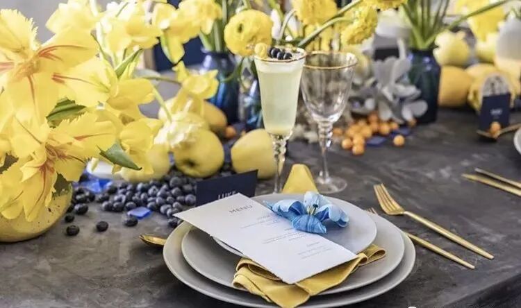 白色、米色、蓝色是常见的餐桌花基调。首先要统一餐桌整体为同一色系,然后在某一部分设定一个对比色作为视觉点。例如,利用夏天的季节感做设计时,主色彩为海蓝色,加上对比色的黄色,演绎出阳光海岸的氛围。