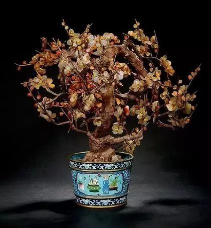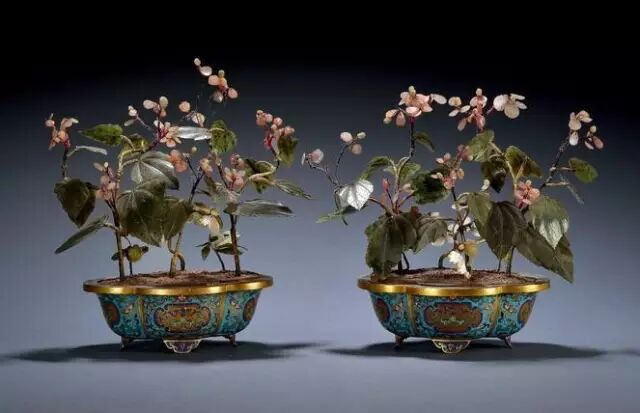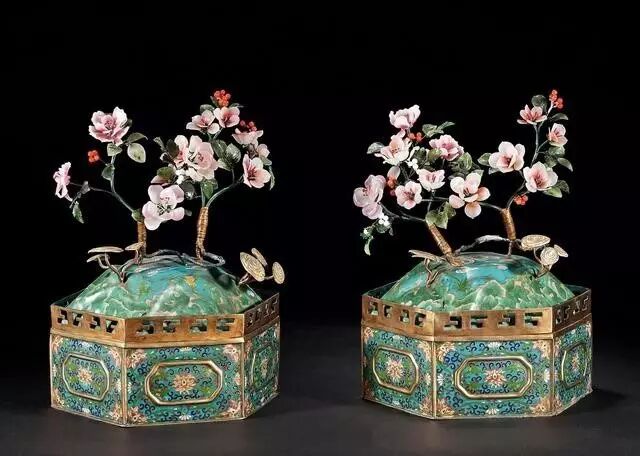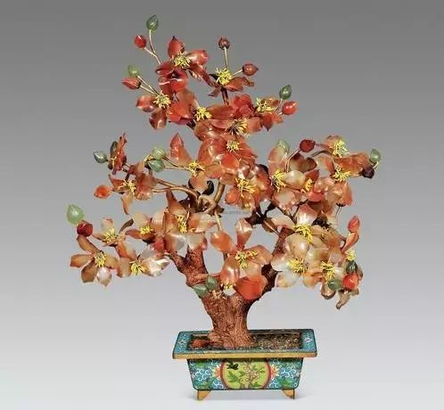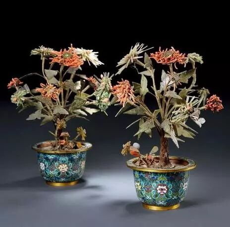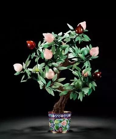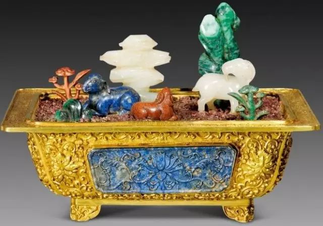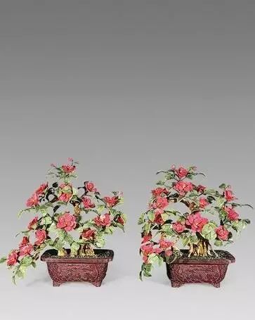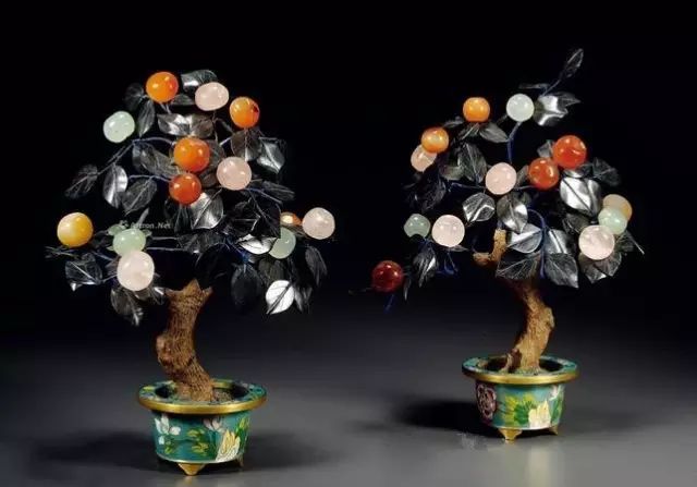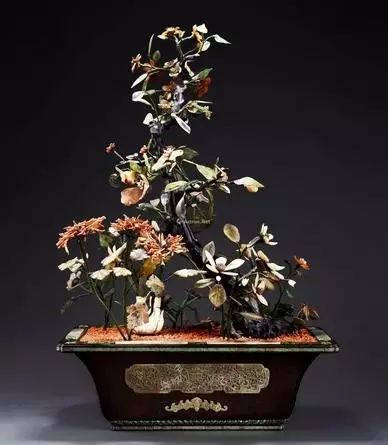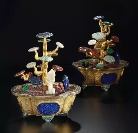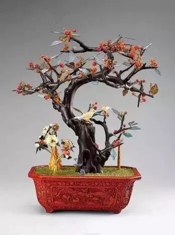 1、清宫廷造办处由于库府资源充分,其制作的盆景往往以大量珍珠宝石堆砌,工艺精巧,景观造型优美,风格富丽堂皇,往往一盆一景即价值连城;
