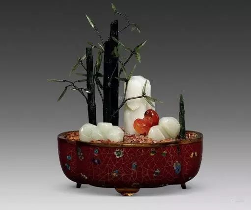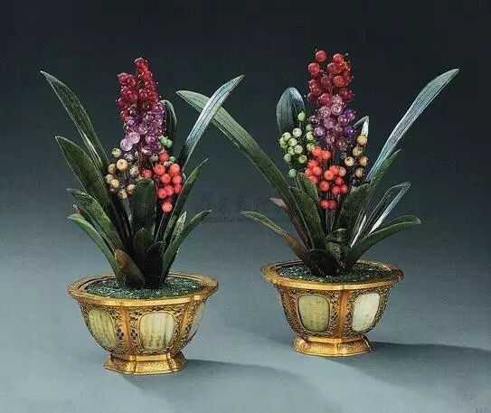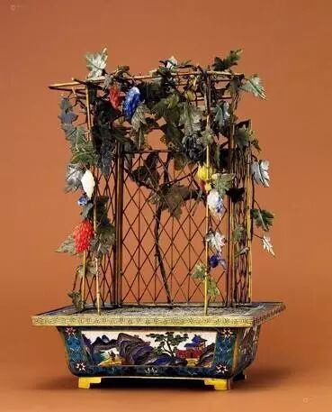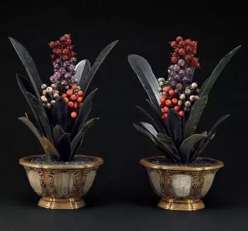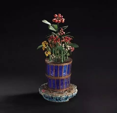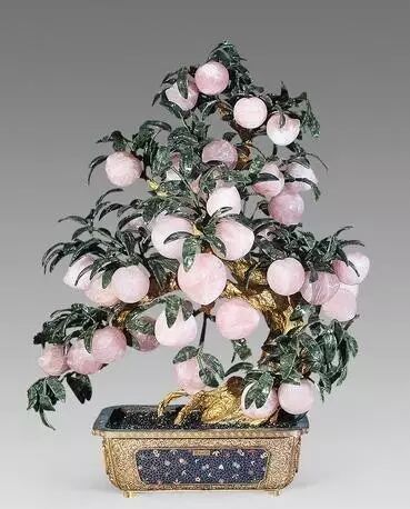 清代宫廷陈设所用以金玉珠宝制作的像生盆景,以衬托宫廷生活环境的堂皇富丽。在四季寒暑分明的北方,这些像生盆景中的花果草木却永远鲜艳欲滴,绚烂夺目,且往往带有明显的吉祥寓意,成为宫廷文化不可或缺的一部分。