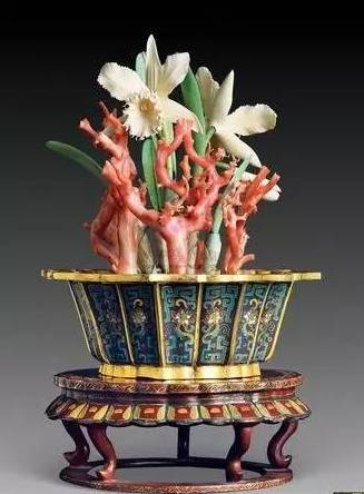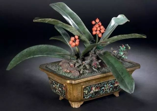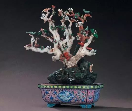 3、广州制作的盆景用盆多为各种色彩的画珐琅。盆中花木枝直叶挺,其杆往往涂金漆,叶则贴翠羽,花卉、果实亦艳丽耀目;