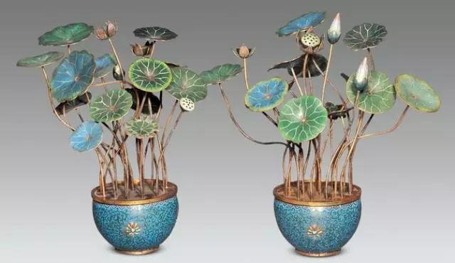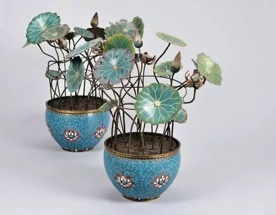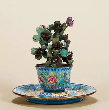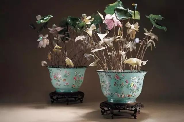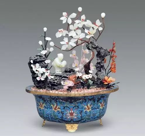 5、扬州盆景用盆以錾胎珐琅类为主,花卉景物多为铜镀金枝干,玉石花叶,清丽娇美。