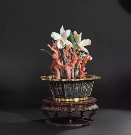 清 铜胎掐丝珐琅珊瑚象牙盆景